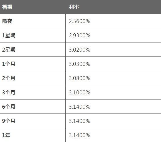 隔夜HIBOR报2.5600%,一周期HIBOR报2.9300%,两周期HIBOR报3.0200%;