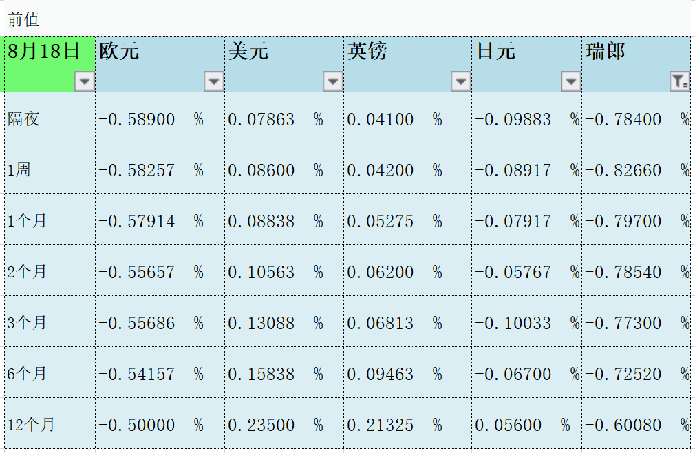隔夜LIBOR:欧元报-0.58986%,美元报0.07850%,英镑报0.04100%,日元报-0.09933%,瑞郎报-0.78520%;
