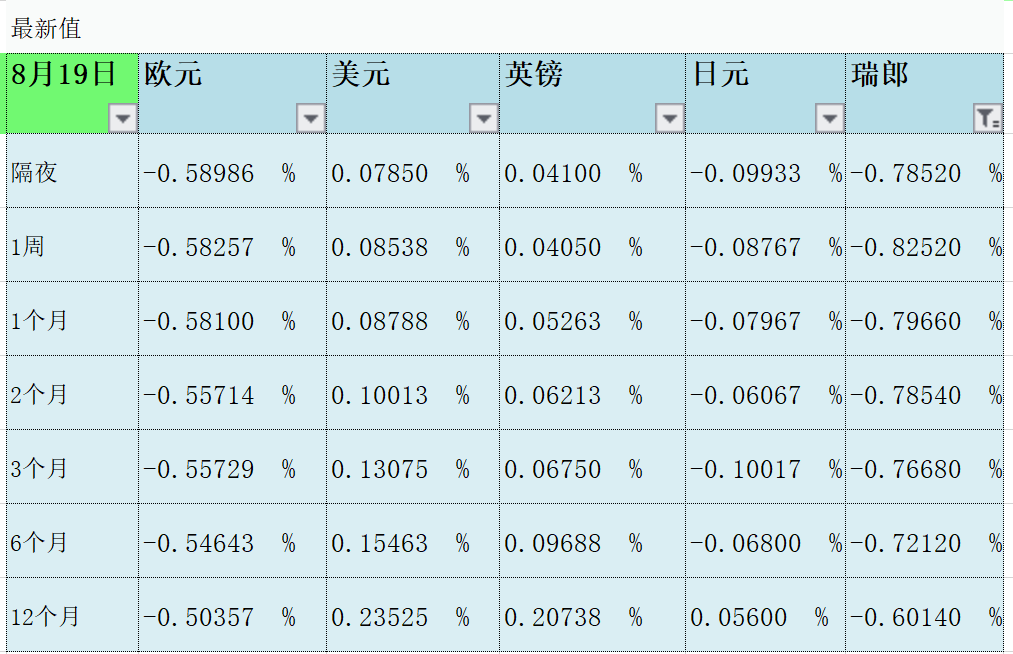 今日(08/20)官网出炉的 2021/08/19 “伦敦银行间拆借利率(LIBOR)”数据如下:
