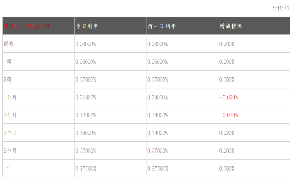 08月24日香港银行间同业拆借利率港币:隔夜报0.06% 1周期报0.06% 1月期报0.07% 3月期报0.16% 6月期报0.27%