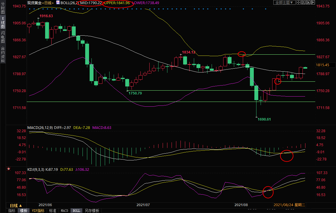日线级别:震荡反弹;MACD金叉,KDJ金叉,金价顶破了布林线中轨压制,短线看涨信号增加,后市有望进一步涨向布林线上轨1842附近。此外,8月4日高点1831.78和1820整数关口,也还分别存在一定的阻力。