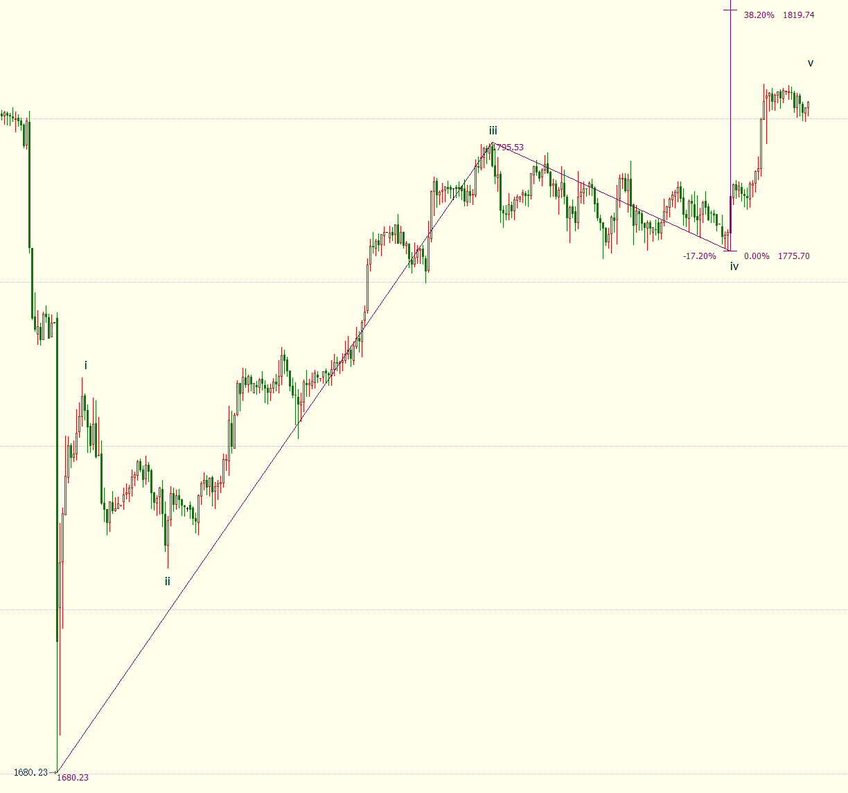 小时图上看,金价自1776美元开启上行v浪,上方阻力看向38.2%目标位1820美元。v浪都是自1680美元开启的上行(i)浪的子浪,(i)浪是同样自1680美元开启的上行((i))浪的子浪。