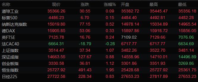 美股收盘情况:道琼斯指数收盘上涨31.67点,涨幅0.09%,报35367.38点;标普500指数收盘上涨7.36点,涨幅0.16%,报4486.90点;纳斯达克综合指数收涨77.1点,涨幅0.52%,报15019.8点。
