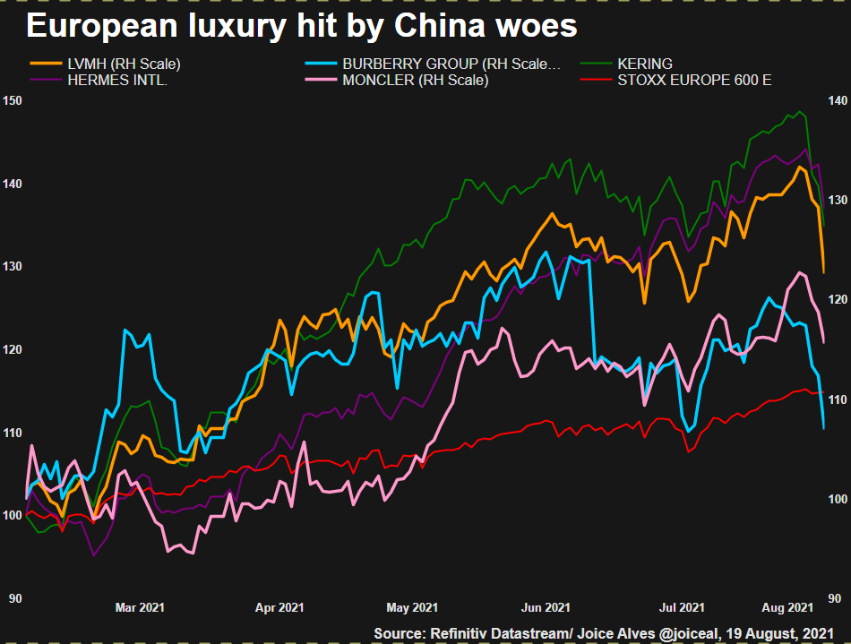 在中国提出财富再分配的计划后,欧洲奢侈品类股的市值蒸发约1200亿美元,8月有两天内下跌了14%。