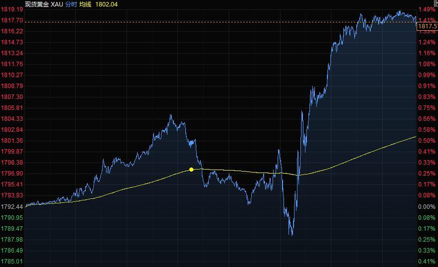 金价周五涨超1%,现货黄金创8月4日以来新高至1819.19美元/盎司,此前美联储主席鲍威尔并未暗示联储将何时开始撤回经济支持,并重申目前的价格急升是暂时的。