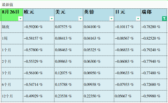1个月LIBOR:欧元报-0.57800%,美元报0.08463%,英镑报0.05325%,日元报-0.06833%,瑞郎报-0.79240%。