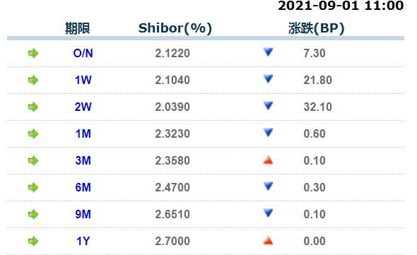 隔夜Shibor报2.1220%,下跌7.30点;1周期Shibor报2.1040%,下跌21.80点;2周期Shibor报2.0390%,下跌32.10点;