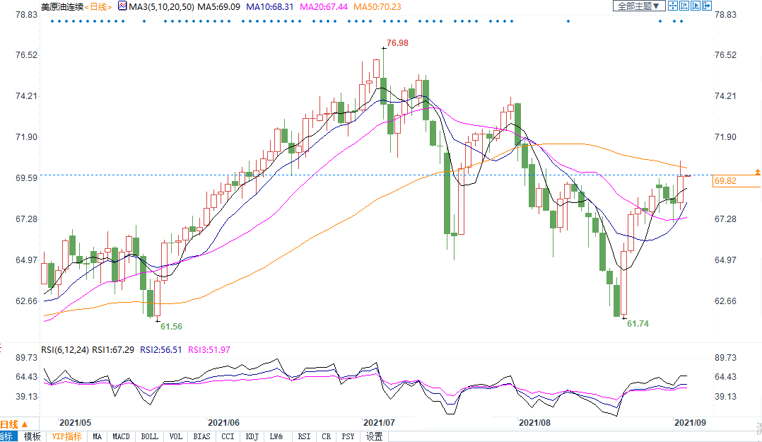 周四(9月2日)美油期货上涨1.40美元,涨幅为2%,结算价报69.99美元/桶;上涨1.44美元,涨幅为2%,报收73.03美元/桶。受对全球经济成长的乐观情绪推动,且之前公布的数据显示美国原油库存降幅超预期,为油价上涨提供支撑。同时投资者押注市场可以消化OPEC+的额外供应,因墨西哥湾地区仍有150万桶的原油生产设施处于停产状态。