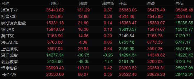 美股收盘情况:标普500指数上涨0.3%,报4536.95点;道琼斯工业平均指数上涨0.4%,报35443.82点;纳斯达克综合指数上涨0.1%,报15331.18点;纳斯达克100指数下跌0.1%,报15604.25点。