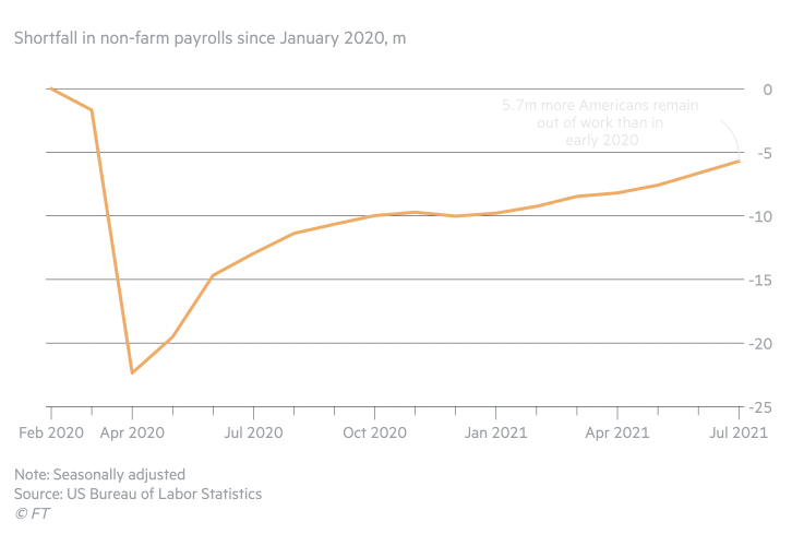 过去17个月期间,美国非农出现很大程度的改善,但距离疫情爆发前的水平还有很大的差距。下面的图表凸显出,2020年初后美国丧失了570万个工作岗位。