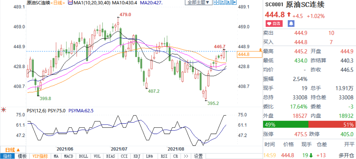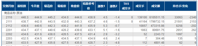 上海原油价格上涨,主力合约2110终盘收于444.8元/桶,涨4.5元/桶,涨幅1.02%。