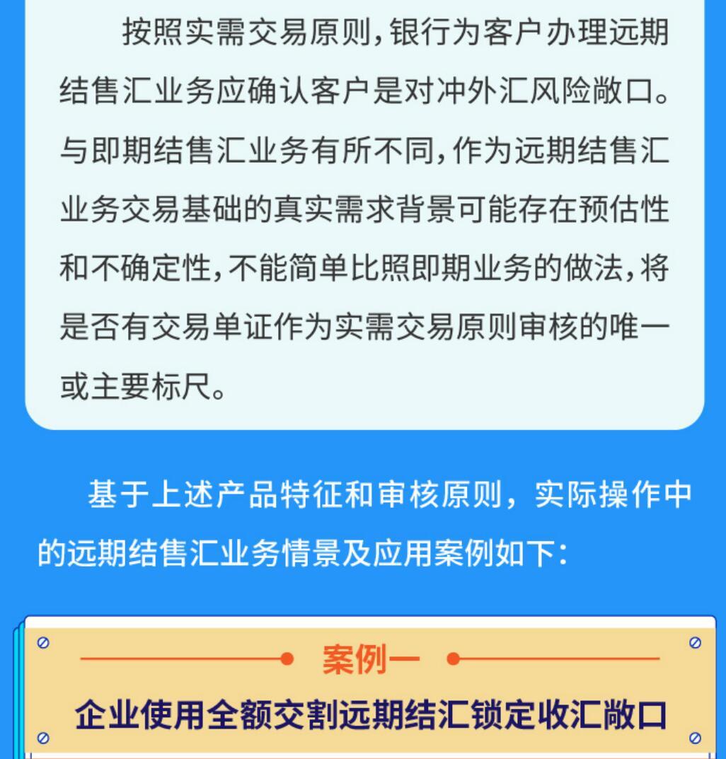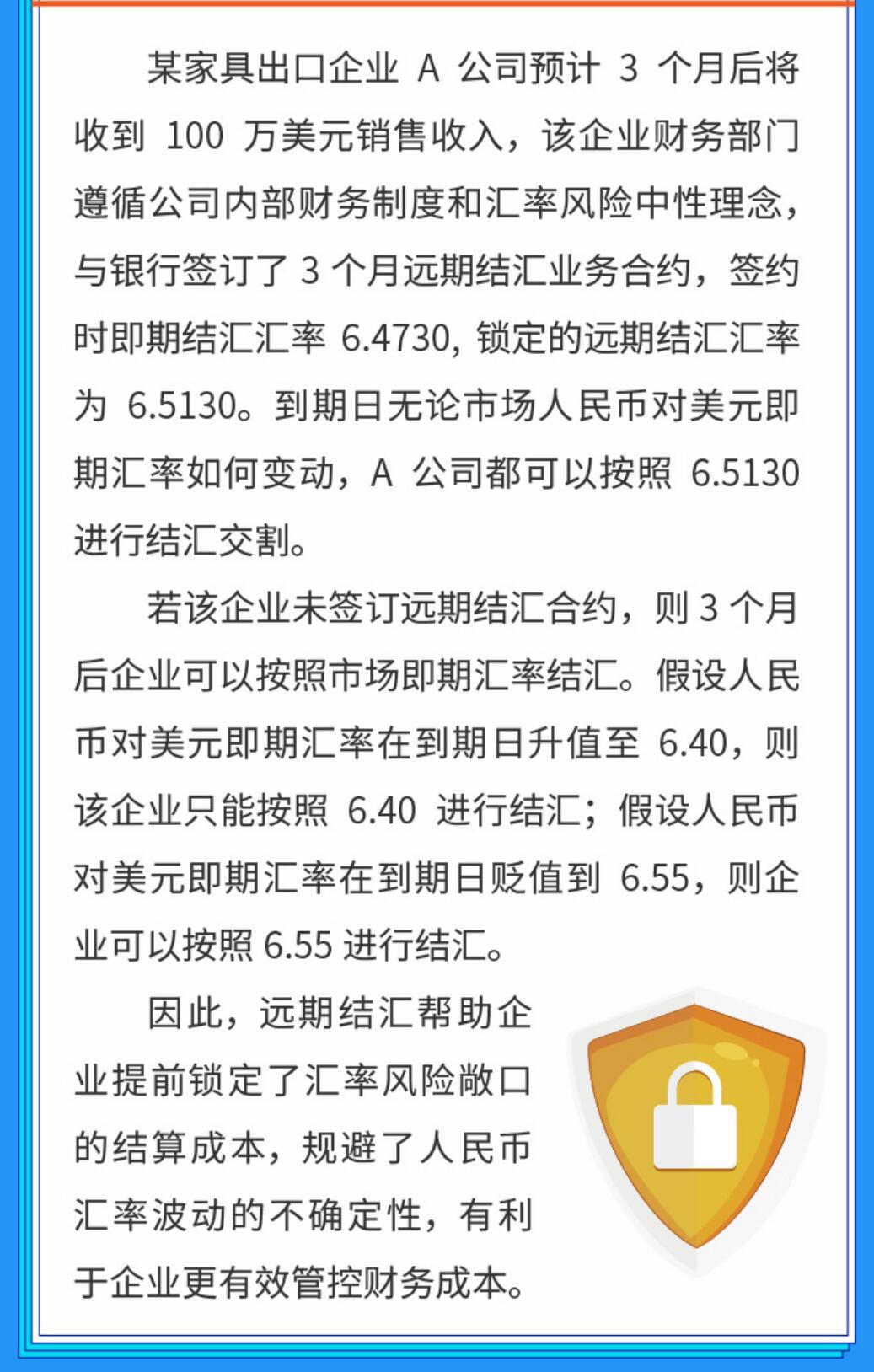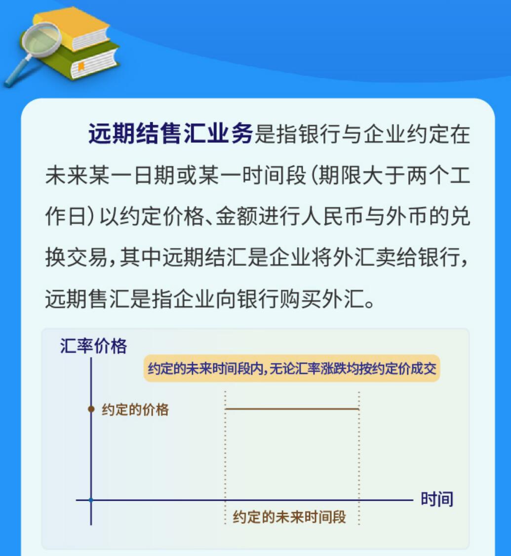 一张图:远期结售汇 别家企业这么做 2021-09-06 21:47 远期结售汇业务是指银行与企业约定在未来某一日期或某一时间段(期限大于两个工作日)以约定的价格、金额进行人民币与外币的兑换交易,其中远期结汇是企业将外汇卖给银行,远期售汇是企业向银行购买外汇……供稿:中国建设银行制作:国家外汇管理局江苏省分局