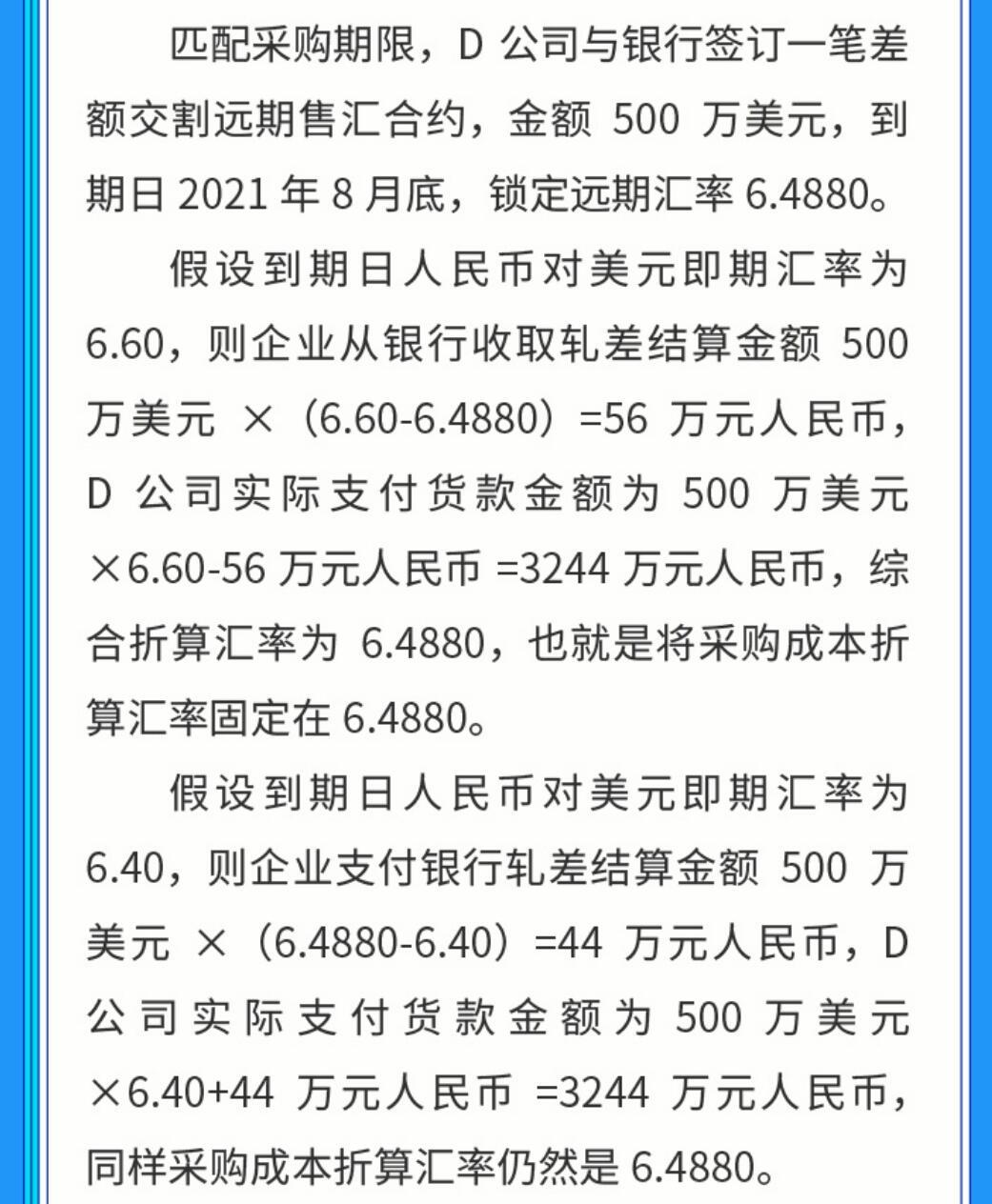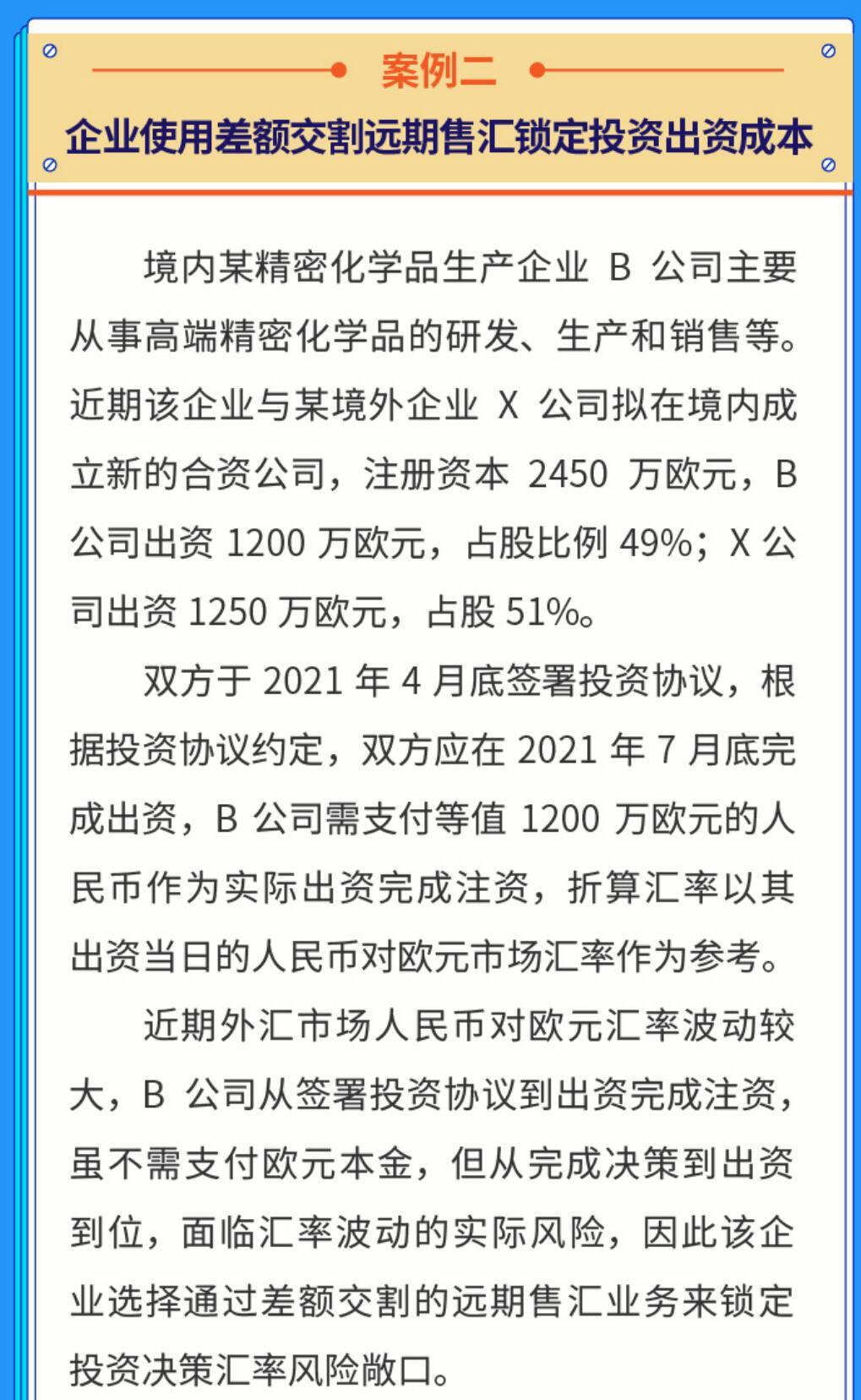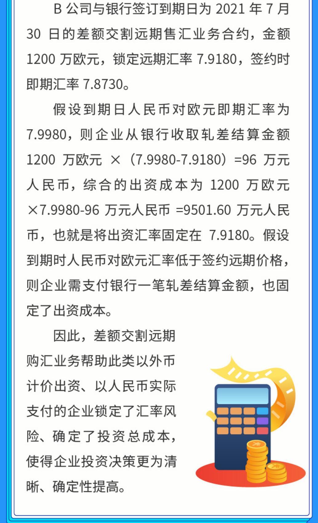 一张图:远期结售汇 别家企业这么做 2021-09-06 21:47 远期结售汇业务是指银行与企业约定在未来某一日期或某一时间段(期限大于两个工作日)以约定的价格、金额进行人民币与外币的兑换交易,其中远期结汇是企业将外汇卖给银行,远期售汇是企业向银行购买外汇……供稿:中国建设银行制作:国家外汇管理局江苏省分局