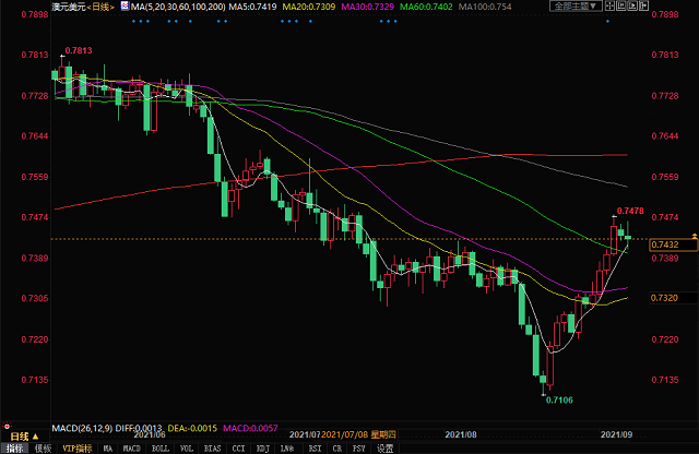 北京时间9月7日15:43,澳元兑美元报0.7432/34