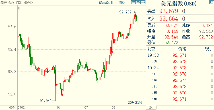 北京时间19:33,现货黄金上涨0.26%至1798.97美元/盎司;COMEX期金主力合约上涨0.14%至1801.0美元/盎司;美元指数上涨0.14%至92.673;欧元兑美元下跌0.20%至1.1818。美指创一周新高至92.732,欧元兑美元跌至一周新低1.1811。