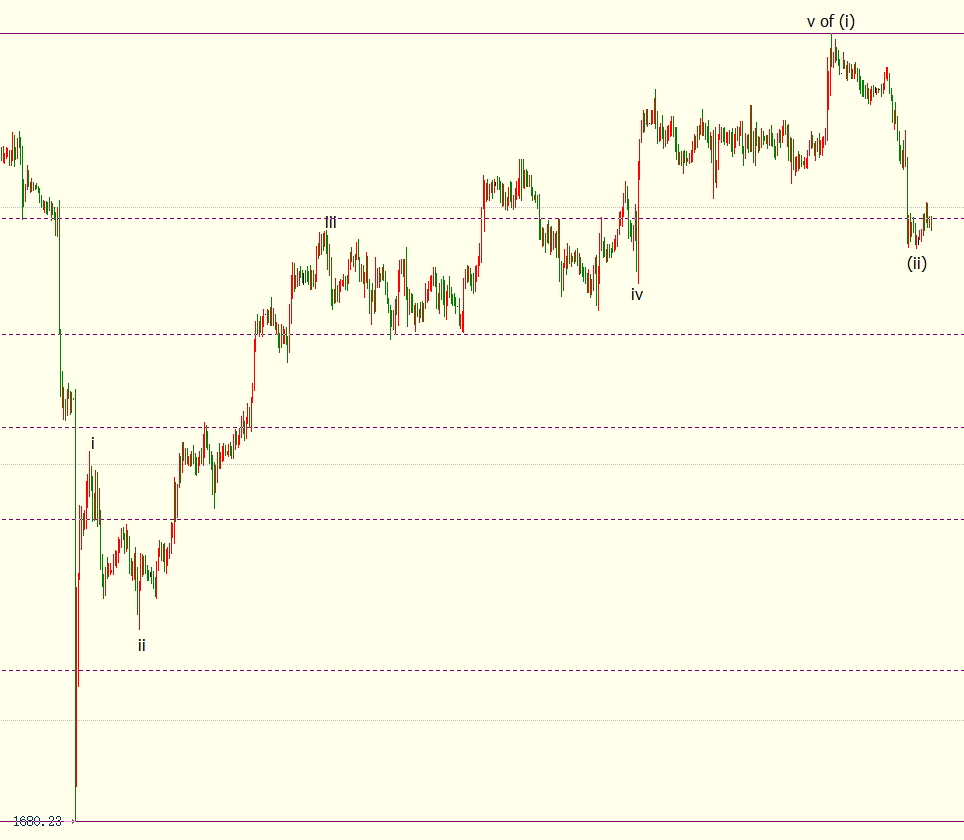 小时图上看,金价自1834美元开启下行(ii)浪走势,跌破(i)浪(1680-1834美元)23.6%目标位1798美元,并有望下探(i)浪38.2%回档位1775美元。(i)浪和(ii)浪是自1680美元开启的上行((i))浪的子浪。