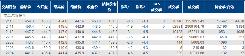 上海原油价格微跌,主力合约2110终盘收于453.8元/桶,跌0.5元/桶,跌幅0.11%。