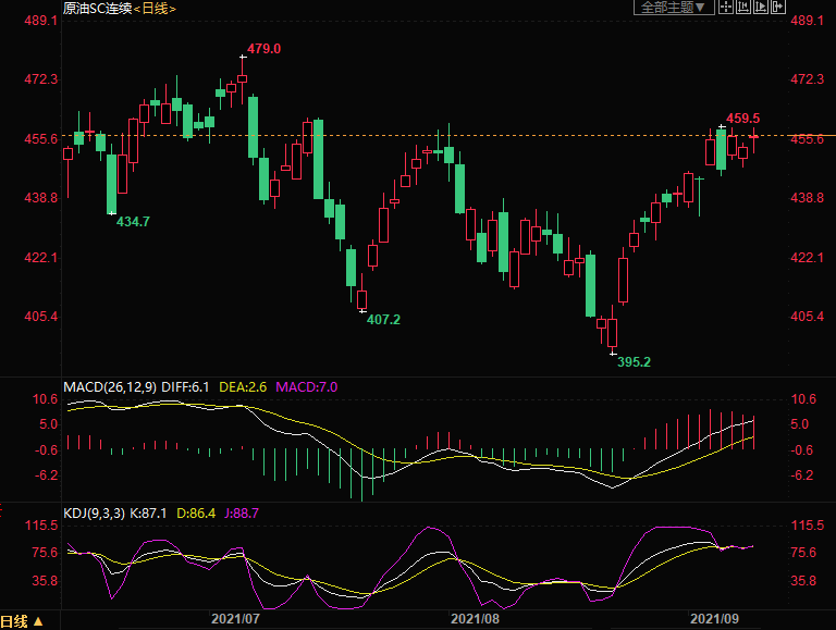 上海原油价格上涨,主力合约2110终盘收于457.1元/桶,涨6.1元/桶,涨幅1.35%。