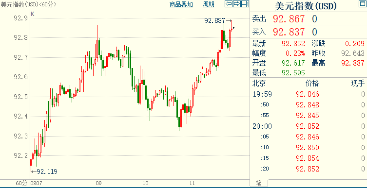 北京时间19:54,现货黄金上浮0.11%至1789.57美元/盎司;COMEX期金主力合约下沉0.06%至1791.1美元/盎司;美元指数上涨0.25%至92.872,盘中触及8月27日以来高位至92.887。