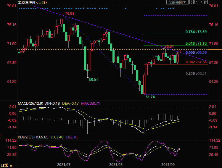 上方初步阻力关注61.8%回撤位71.17,进一步关注8月3日高位71.94及76.4%回撤位73.39。