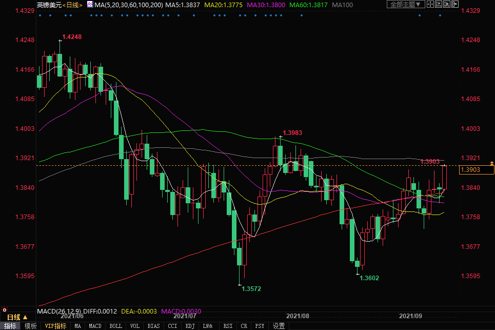 周二(9月14日),英国公布的8月在职员工数量超过疫情封锁前的水平,同时,职位空缺超过100万,创历史新高。乐观的就业数据及走高的通胀令投资者对于英国央行提早加息的预期升温。另一方面,刚刚公布的美国8月CPI数据小幅走低,这令投资者猜测通胀水平已经触顶,美联储减码及加息的压力再次降低,令美元承压,英镑兑美元则在重重利好推动下冲破1.39,创逾一个月新高。