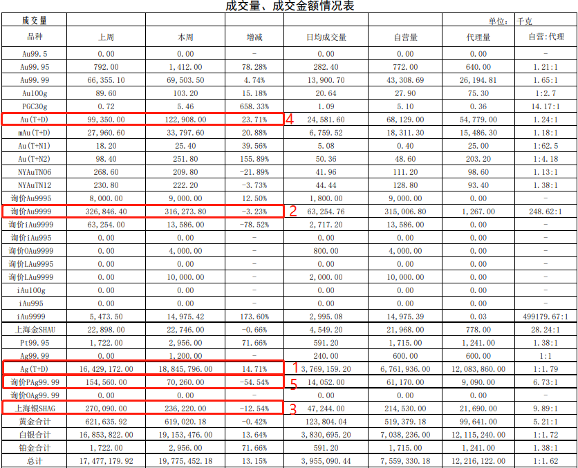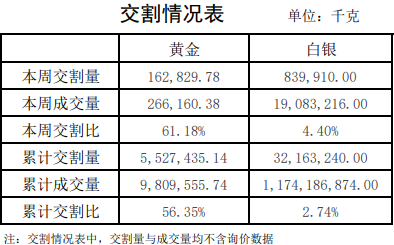 黄金交割比由62.85%跌至61.18%,白银交割比从4.3%升至4.4%。