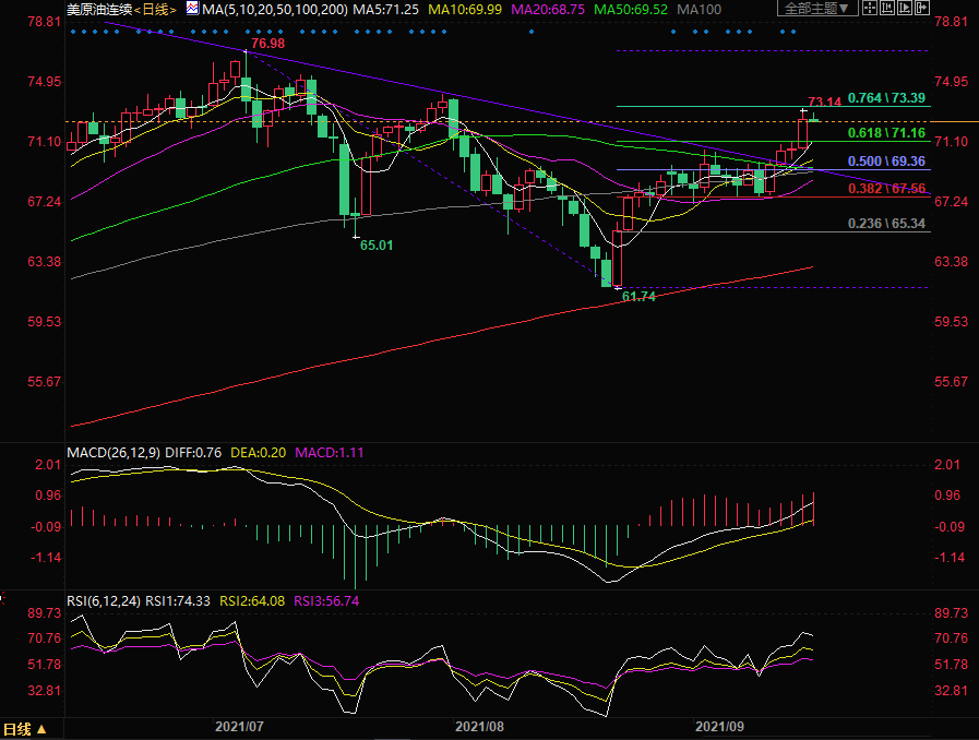 下方初步支撑关注61.8%回撤位71.16,进一步关注50%回撤位69.36以及38.2%回撤位67.56。