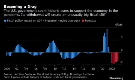 美国政府花费创纪录的资金支撑疫情期间的美国经济,撤销的话将导致巨大的财政悬崖。图中蓝色柱代表财政政策对美国GDP的贡献,而红色柱代表预测2022年将对经济造成拖累