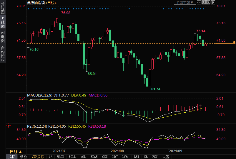 周二(9月21日)美原油小幅上涨,短线油价走势震荡,建议保守者观望,技术面油价仍有进一步的上涨机会,激进者可考虑逢低做多。
