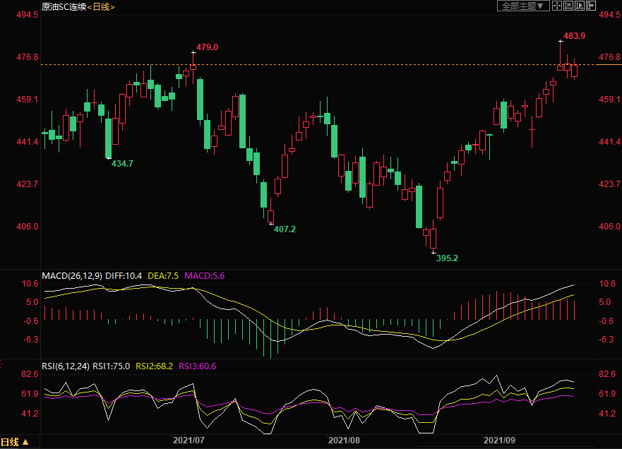 上海原油价格上涨,主力合约2111终盘收于473.9元/桶,涨1.3元/桶,涨幅0.28%。