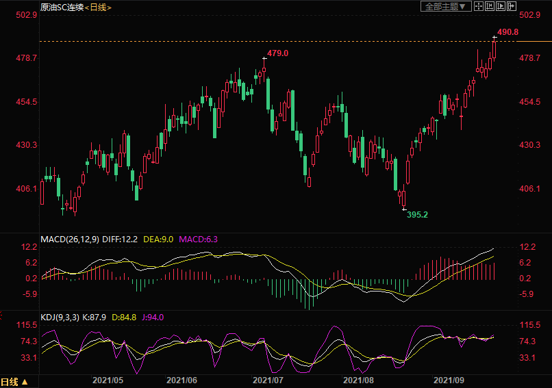 周五(9月24日)上海原油价格上涨,创逾20个月新高,主力合约2111终盘收于488.6元/桶,涨11.6元/桶,涨幅2.43%,市场普遍的冒险情绪以及供应趋紧的担忧支撑油价。