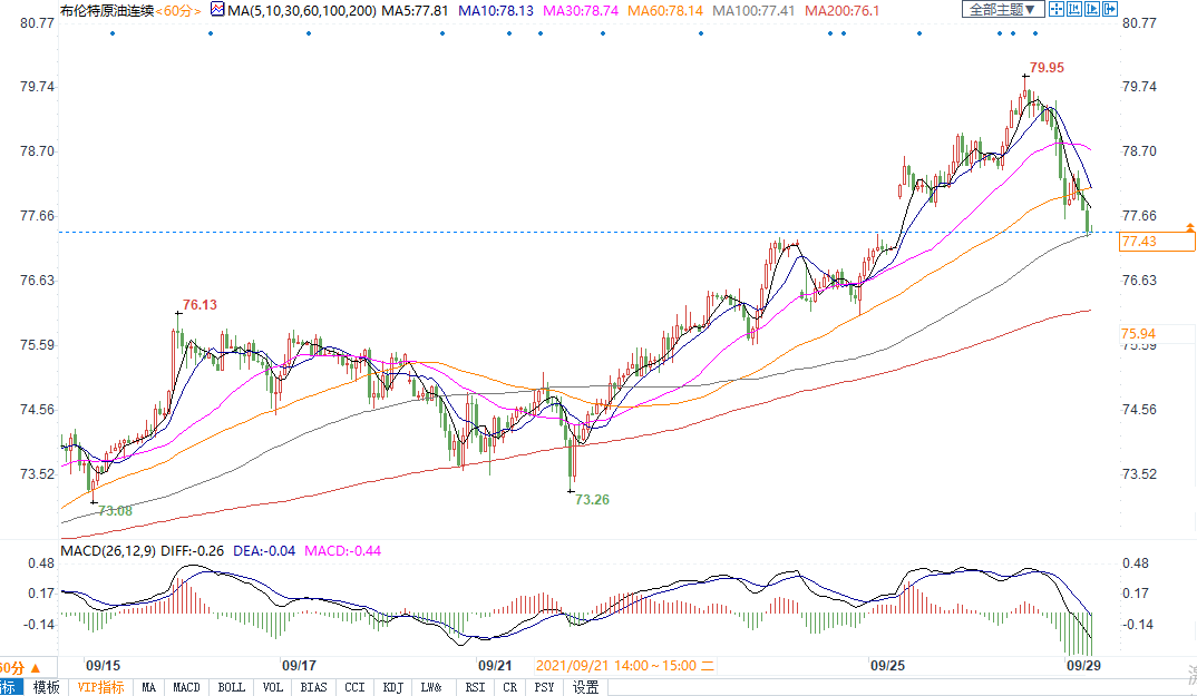 周二(9月28日)布油11月合约尾盘下跌1.31美元,跌幅为1.65%,报收78.22美元/桶,盘中一度升至80.75美元/桶为近三年来首次。美油下跌1.12美元,跌幅为1.48%,报收74.33美元/桶,此前曾创下7月份以来的最高纪录76.67美元。受美国股市暴跌拖累,长达五天的涨势失去了动力,油价回落。API公布的数据显示,截至9月24日当周,原油库存意外增加412.7万桶,汽油库存增加355.5万桶,令油价再度承压。