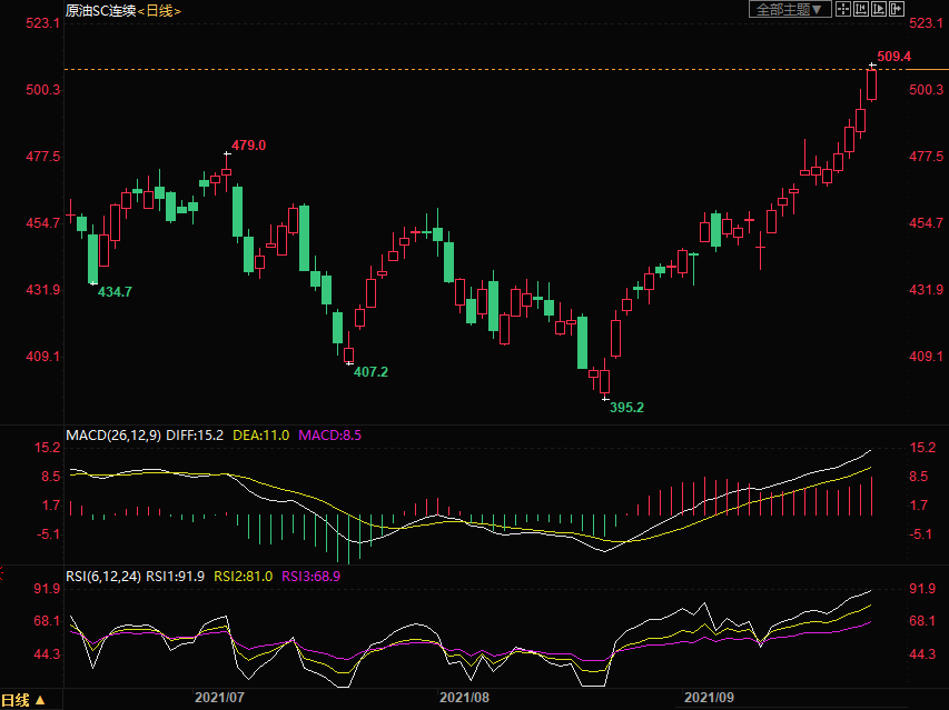 周二(9月28日)上海原油价格上涨,刷新20个月新高,主力合约2111终盘收于507.6元/桶,涨15.4元/桶,涨幅3.13%,因担心供应紧张,液化天然气(LNG)和煤炭价格的飙升也助油价一臂之力。