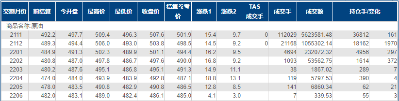 上海原油价格上涨,刷新20个月新高,主力合约2111终盘收于507.6元/桶,涨15.4元/桶,涨幅3.13%。