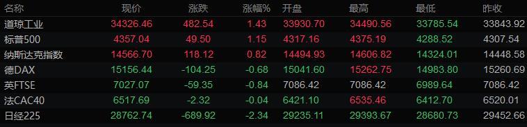 美股收盘情况:标普500指数上涨1.2%,报4357.04点;道琼斯工业平均指数上涨1.4%,报34326.46点;纳斯达克综合指数上涨0.8%,报14566.7点;纳斯达克100指数上涨0.7%,报14791.87点;罗素2000指数上涨1.7%,报2241.632点。