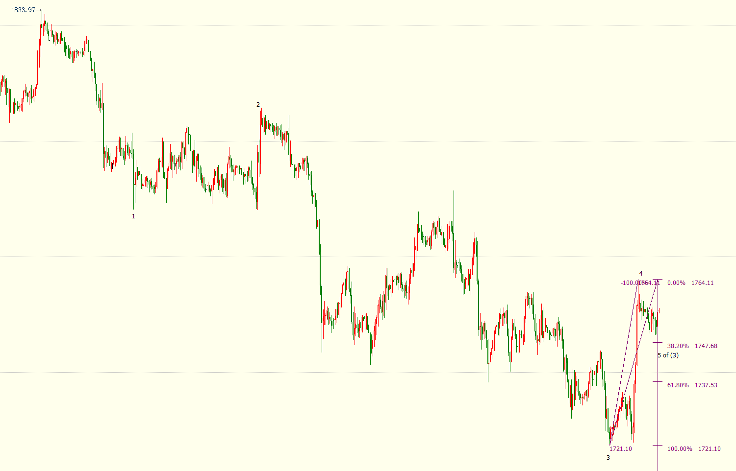 小时图上看,金价料自1764美元开启下行5浪走势,料跌破38.2%目标位1748美元,并进一步下探61.8%目标位1738美元。5浪是(3)浪的子浪。