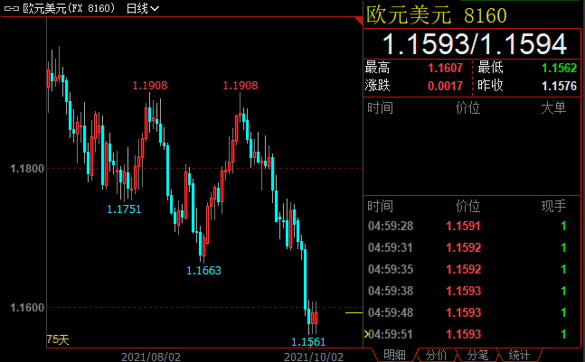 欧元兑美元创6月18日当周以来最大跌幅1.08%,盘中刷新2020年7月23日以来低点至1.1561。疫情对全球经济的打击令各大洲的供应链受扰,导致全世界一系列商品和服务短缺,欧洲央行行长拉加德对此表达了担忧。