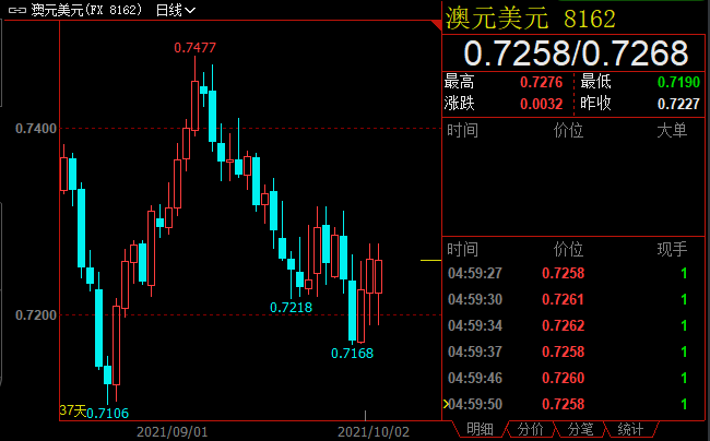 澳元兑美元汇率相对抗跌,自8月23日以来低点0.7168反弹,终盘收于0.7258,几乎持稳。澳元得益于澳洲疫苗接种速度加快,以及铁矿石价格在中国十一黄金周假期前回升。