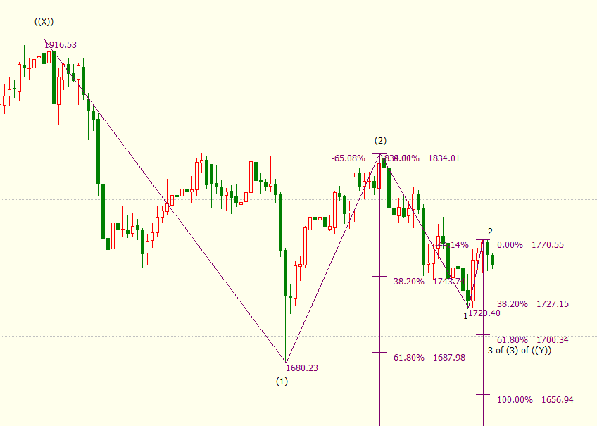 日线图上看,金价自1770美元开启下行3浪走势,下方支撑看向23.6%目标位1744美元和38.2%目标位1727美元。3浪是自1834美元开启的下行(3)浪的子浪。(3)浪则是自1917美元开启的下行((Y))浪的子浪。((Y))浪隶属于自2075美元5开启的调整IV浪。