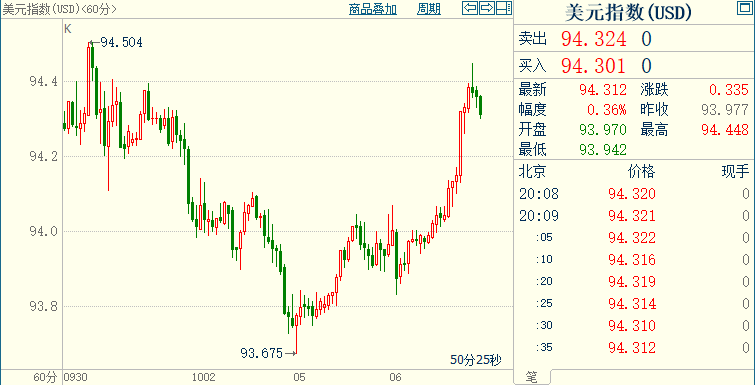 北京时间20:08,现货黄金下跌0.15%至1757.47美元/盎司;COMEX期金主力合约下跌0.18%至1758.0美元/盎司;美元指数上涨0.36%至94.316。