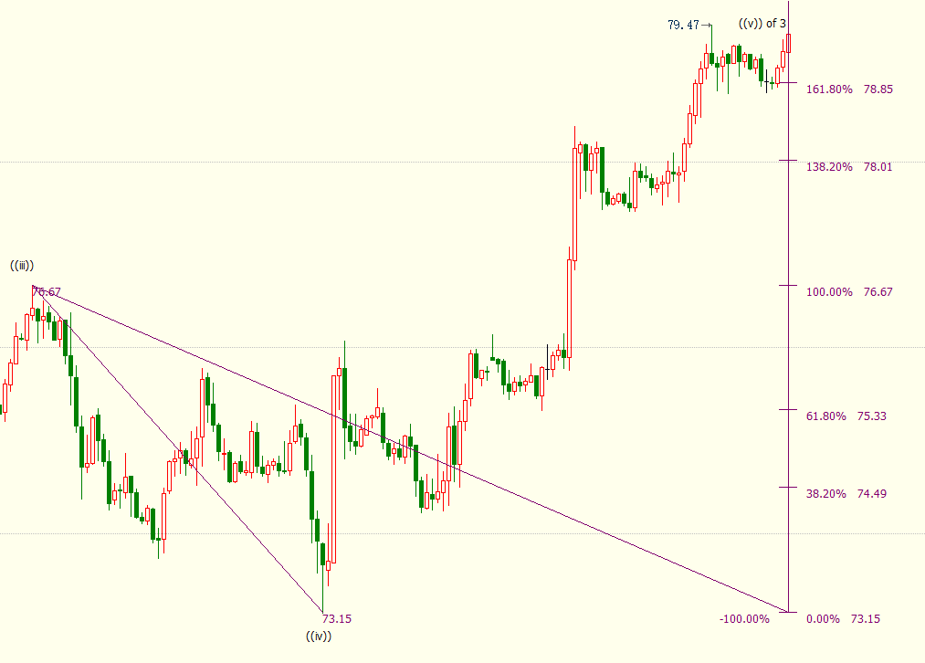 小时图上看,油价处于自73.15美元开启的上行((v))浪,上破176.4%目标位79.36美元,上方阻力看向185.4%目标位79.68美元。((v))浪是自67.58美元开启的上行3浪的子浪。
