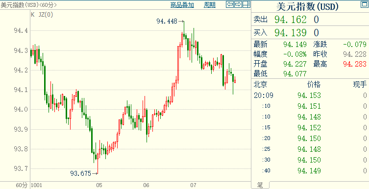 北京时间20:09,现货黄金下跌0.06%至1761.85美元/盎司;COMEX期金主力合约上浮0.02%至1762.1美元/盎司;美元指数下跌0.08%至94.148。