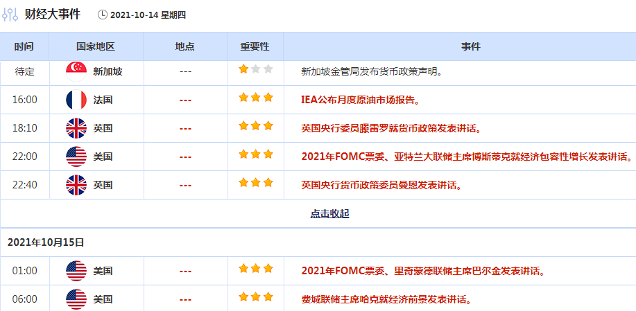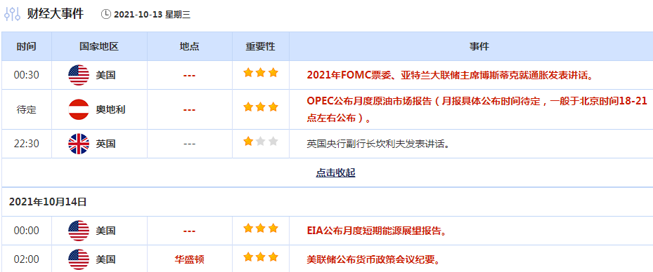 需要提醒的是,周一恰逢美国哥伦布日,美国金融市场周一休市,受此影响,本周的API原油库存数据和EIA原油库存数据均延迟一个交易日公布,API原油库存将于北京时间10月14日凌晨4:30出炉,EIA原油库存数据将北京于10月14日23:00公布。