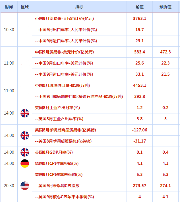 周四(10月14日)关键词:中国9月CPI和PPI、美国9月PPI数据