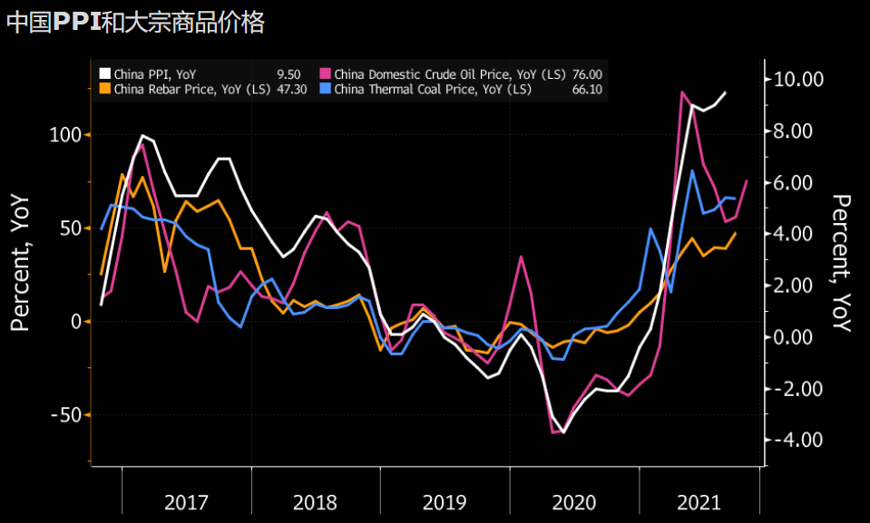 的PPI跟踪指标在9月进一步上升,反映了大宗商品价格上涨。螺纹钢价格同比上涨47%,涨幅高于8月的39%。国内石油和煤炭价格较上年同期上涨超过50%。
