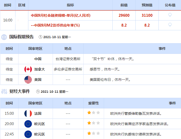 周一(10月11日)关键词:中国9月社会融资规模、美国哥伦布日;