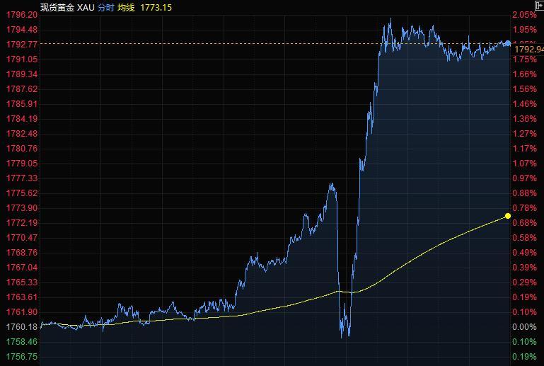 金价周三大涨,现货黄金一度涨逾2%,刷新近一个月高点至1796.2美元/盎司,因美元和美债收益率回落,提振了对黄金的避险需求。