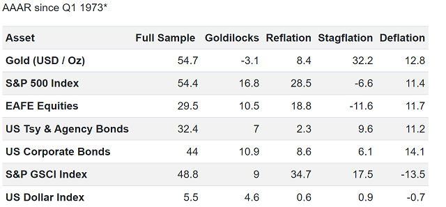 图4:1973年以来每个周期阶段的主要资产回报率:在滞胀中,黄金是明显的赢家