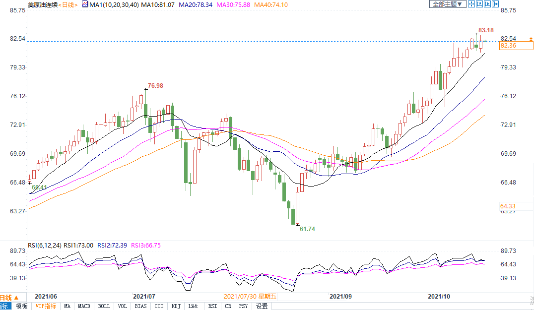 周二(10月20日)布油上涨0.75美元,涨幅为0.89%,结算报85.08美元/桶,为2018年10月以来首次收在85美元上方。美油上涨0.52美元,涨幅为0.63%,报收82.95美元/桶。全球能源供应持续吃紧,亚洲气温下降,重新引发外界担忧原油消费大国在煤电供应短缺之际是否有能力满足取暖需求。同时,随着股市上涨和美元走弱,风险偏好情绪主导市场,油价走高。