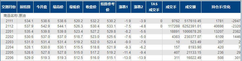 上海原油价格下跌,主力合约2112终盘收于530.4元/桶,跌7.5元/桶,跌幅1.39%。
